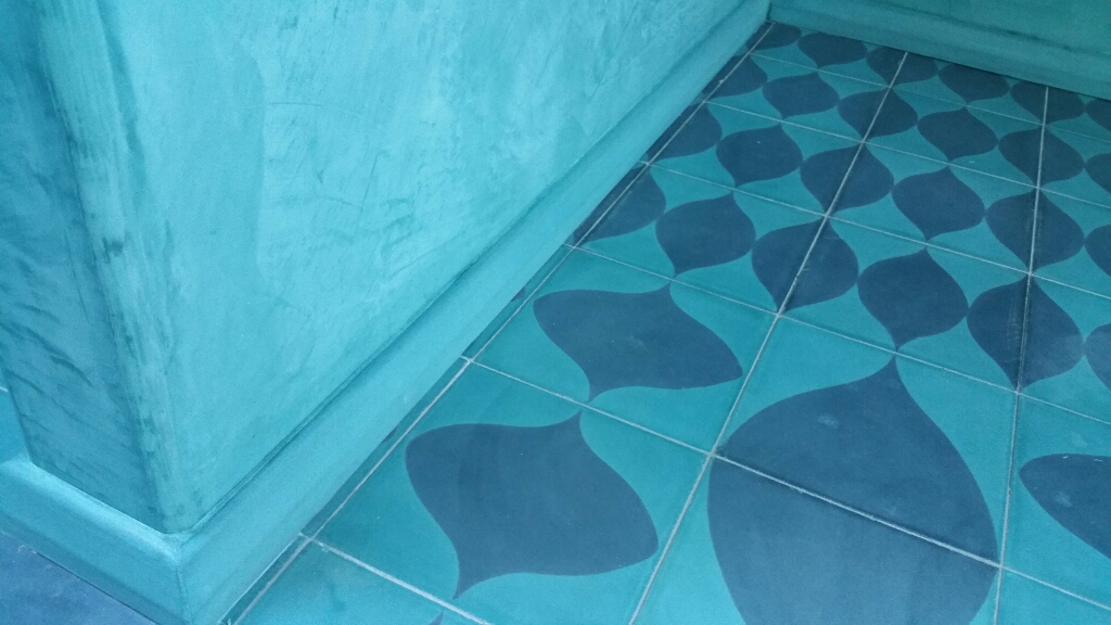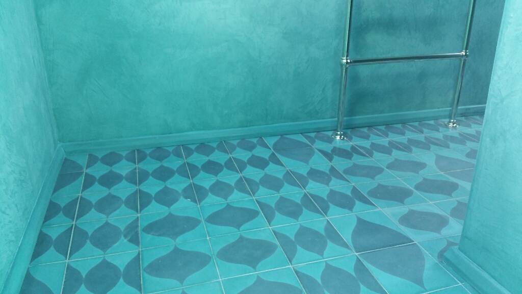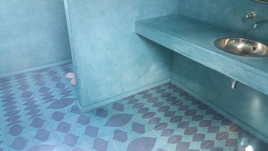 This Moroccan look washroom was completed by milesnegusfancey.com and myself in 2015, we matched the colour of the hand made floor tiles and created a bespoke Japanese shikkui plaster finish for the walls, ceilings and counter, to finish off we cast and fitted coloured stone skirting detail to designers requirments.