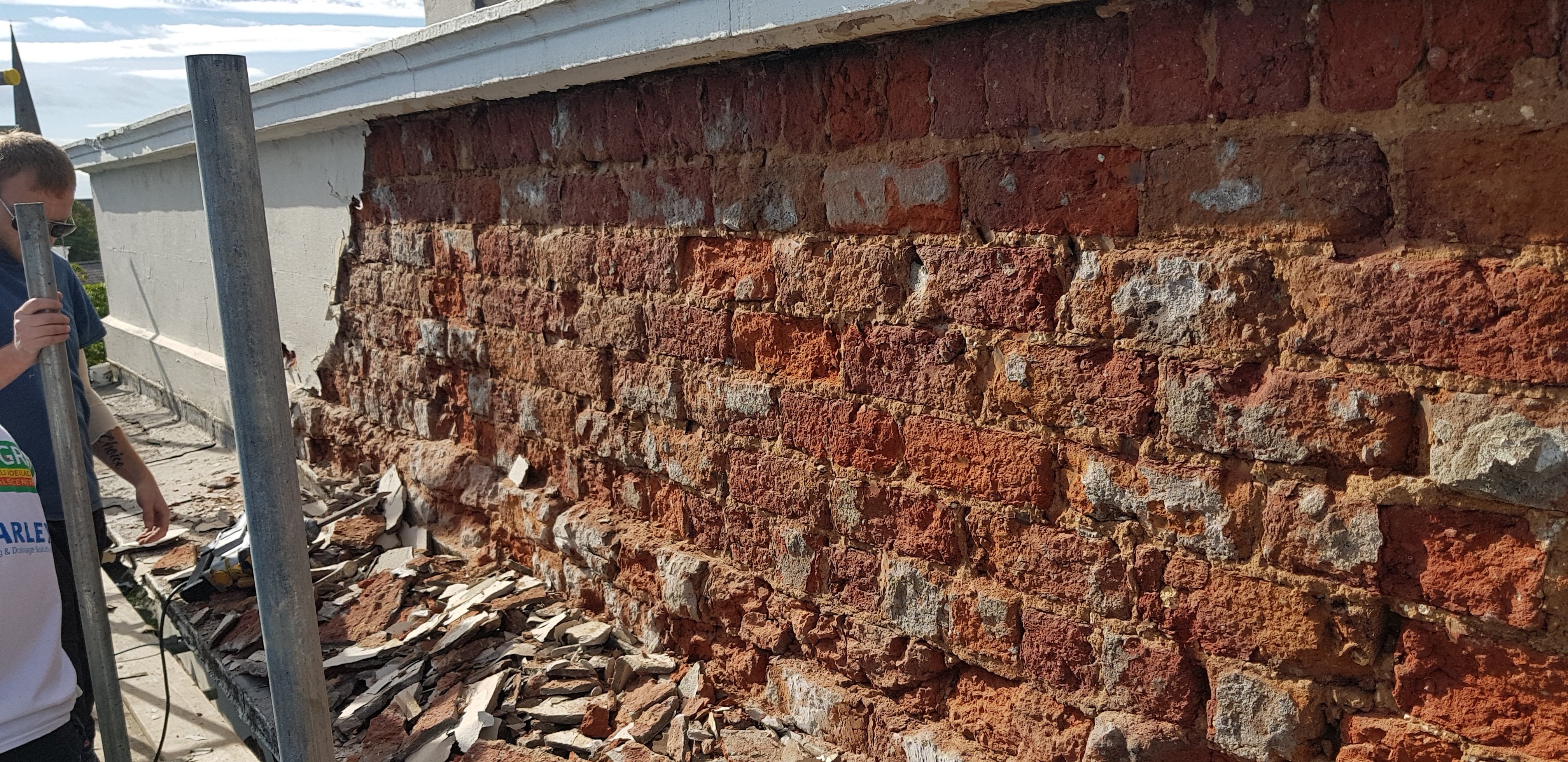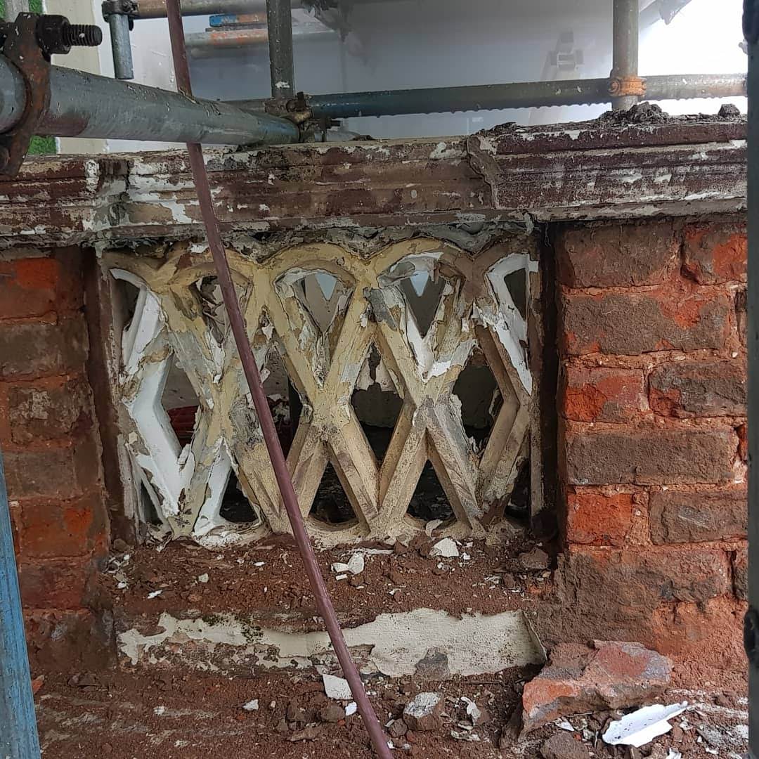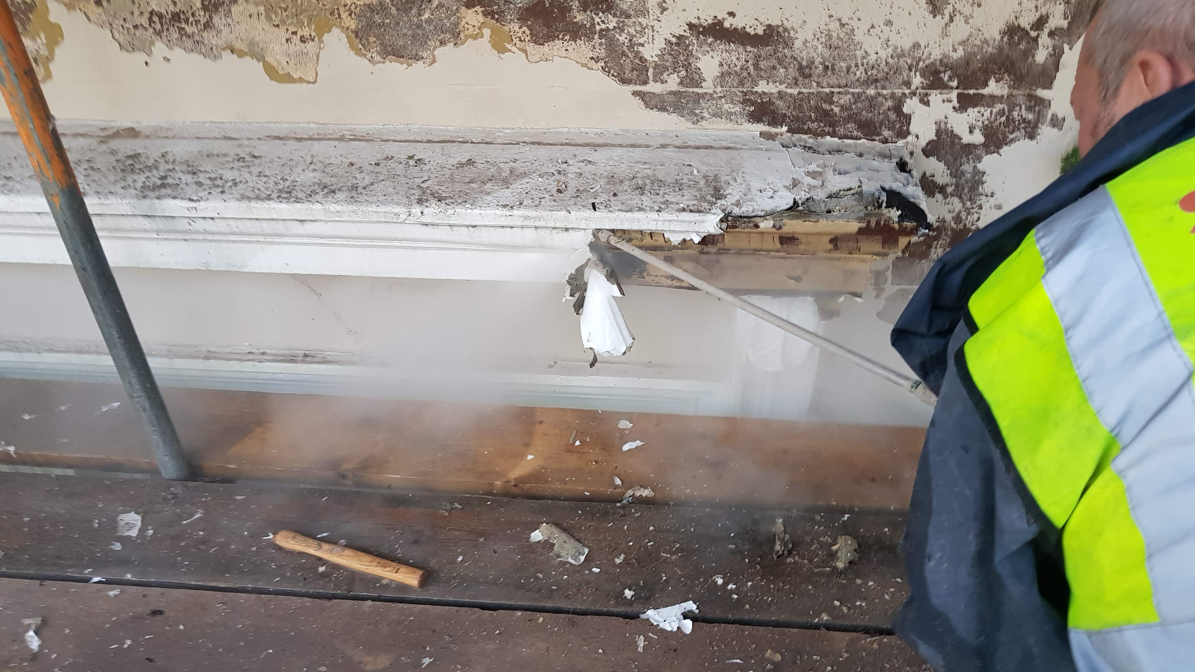 Around the 1970’s the building had also been painted with a cement based paint, sold as a waterproof paint solution that formed a thick impenetrable crust, moisture was still trapped behind this layer and the only way to remove this coating was by continuously chipping or pecking away with small chisels and hammers.