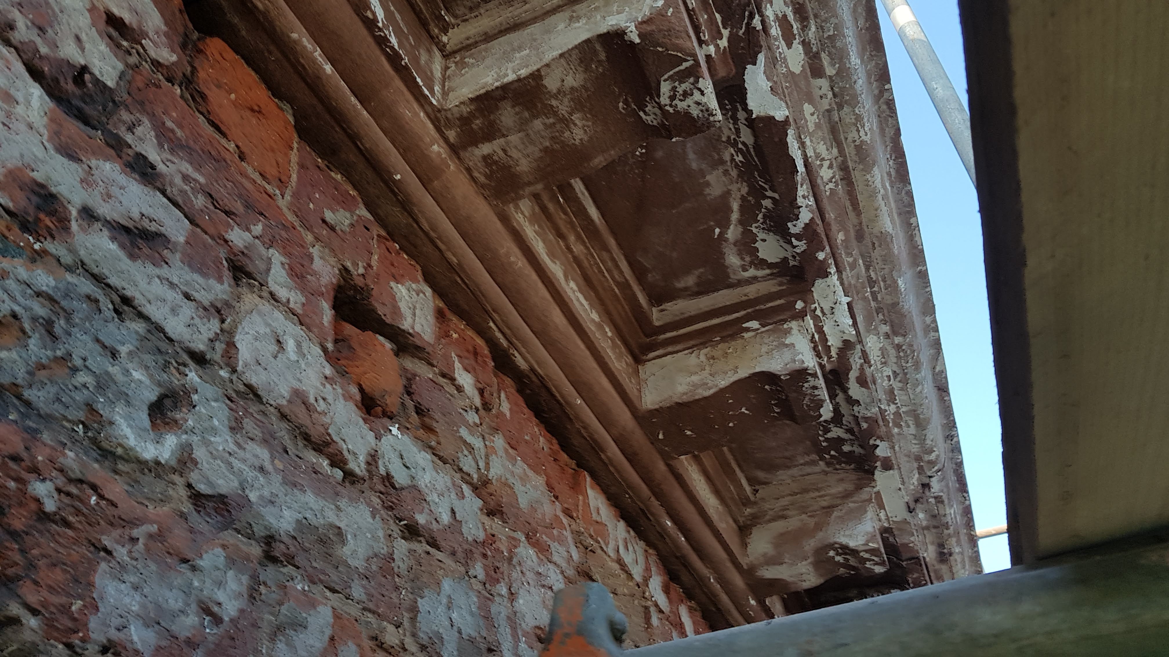 In some places the layers of paint scraped off with hand tools, moisture had softened the mineral paint below and can be seen forming blisters along the face of the moulding