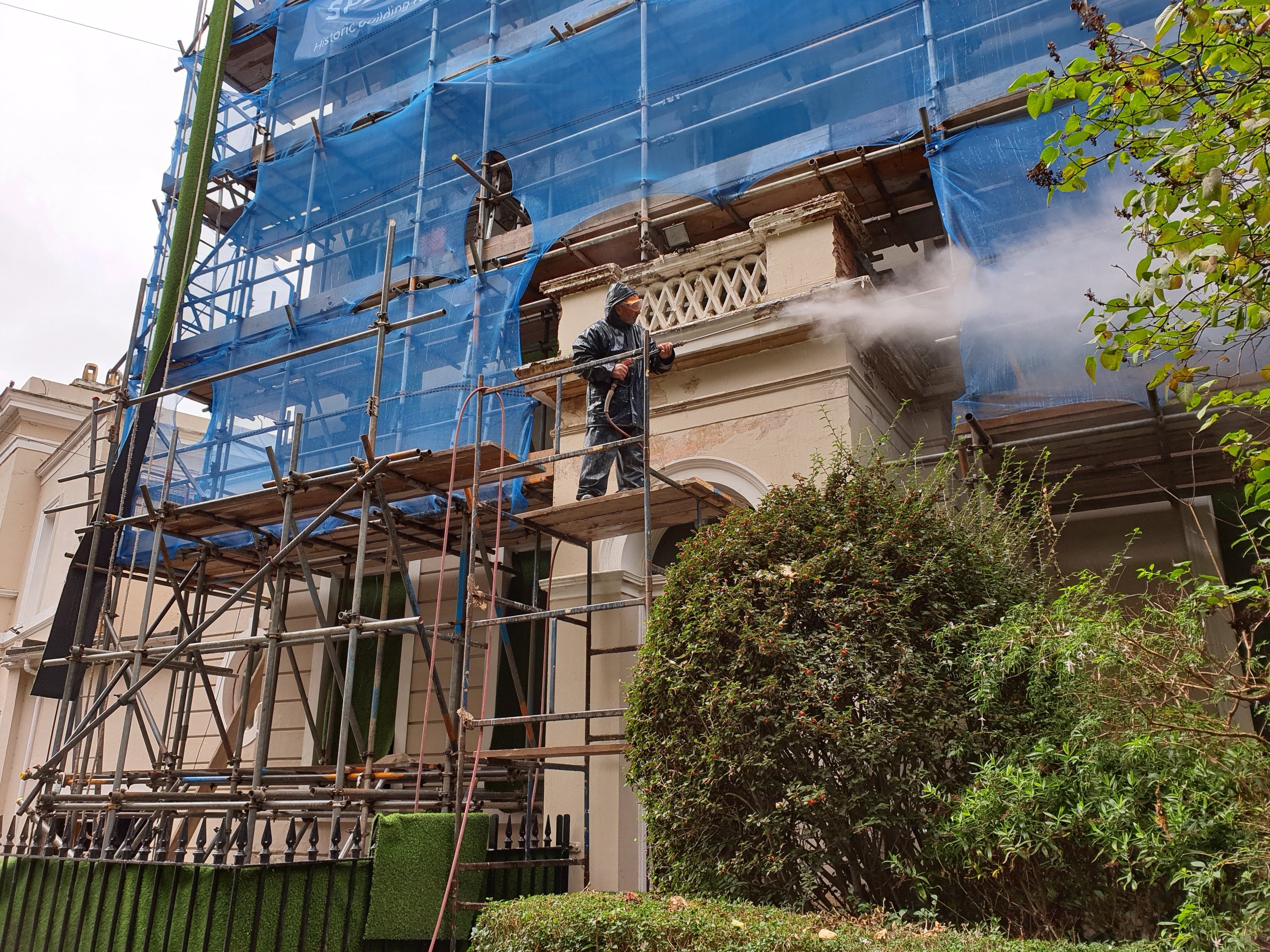 When all the chipping off and major removal is complete we begin working our way down the building using our high pressure THERMATECH, superheated water system to remove any remaining coatings. Adjusting the pressure and temperature to minimise damage to the substrate.