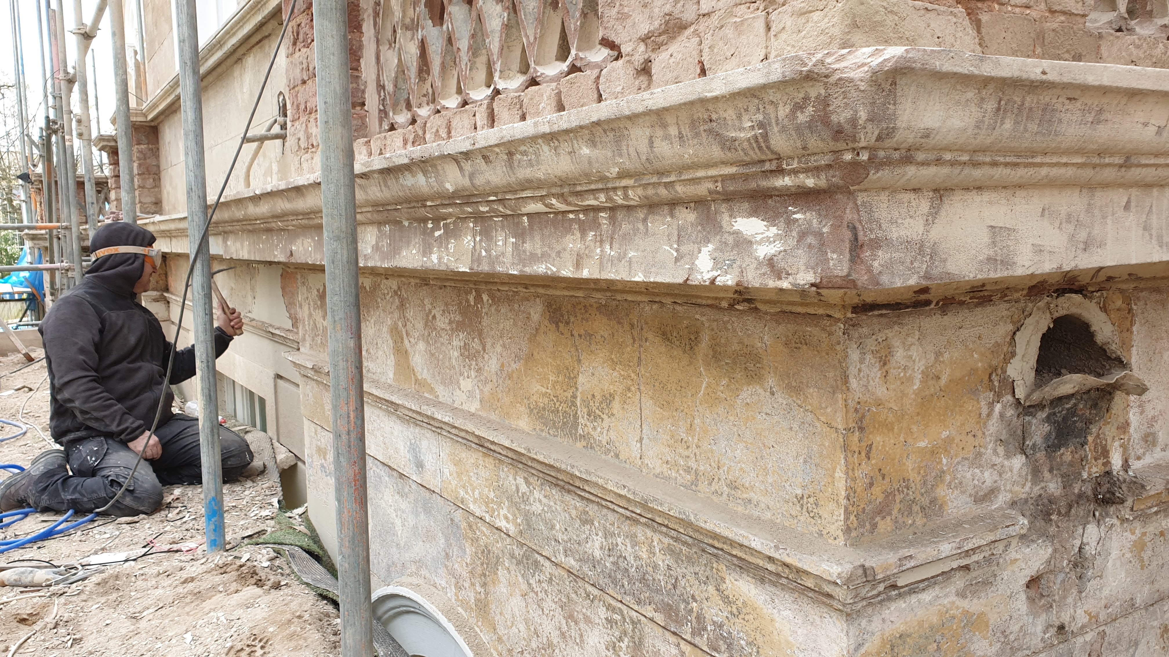 The original stucco plasterwork and sandstone details on some of the lower levels were in a restorable condition in most places, long days of carefully pecking away the hard layers will be followed by high pressure steam to remove any remaining coatings.